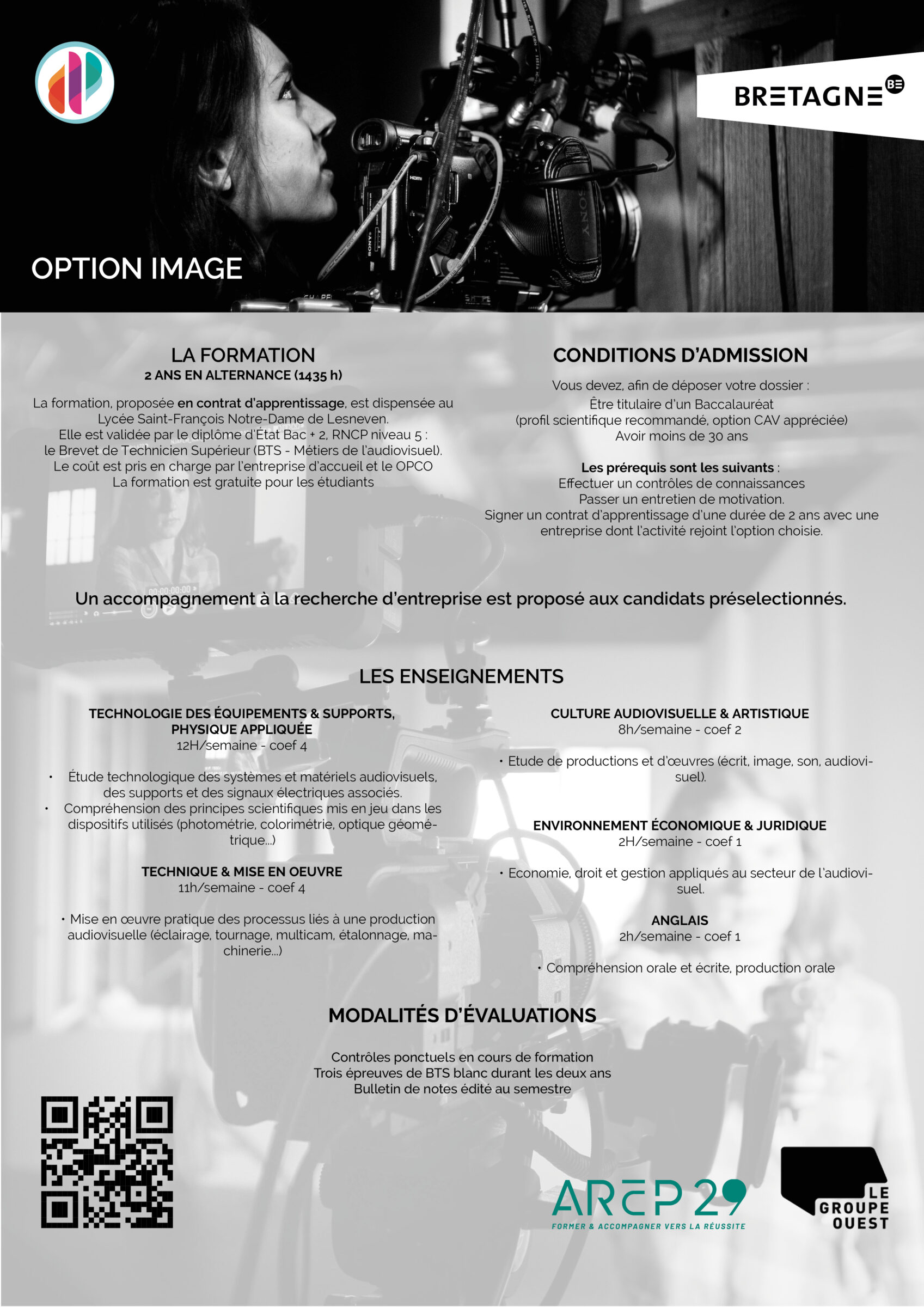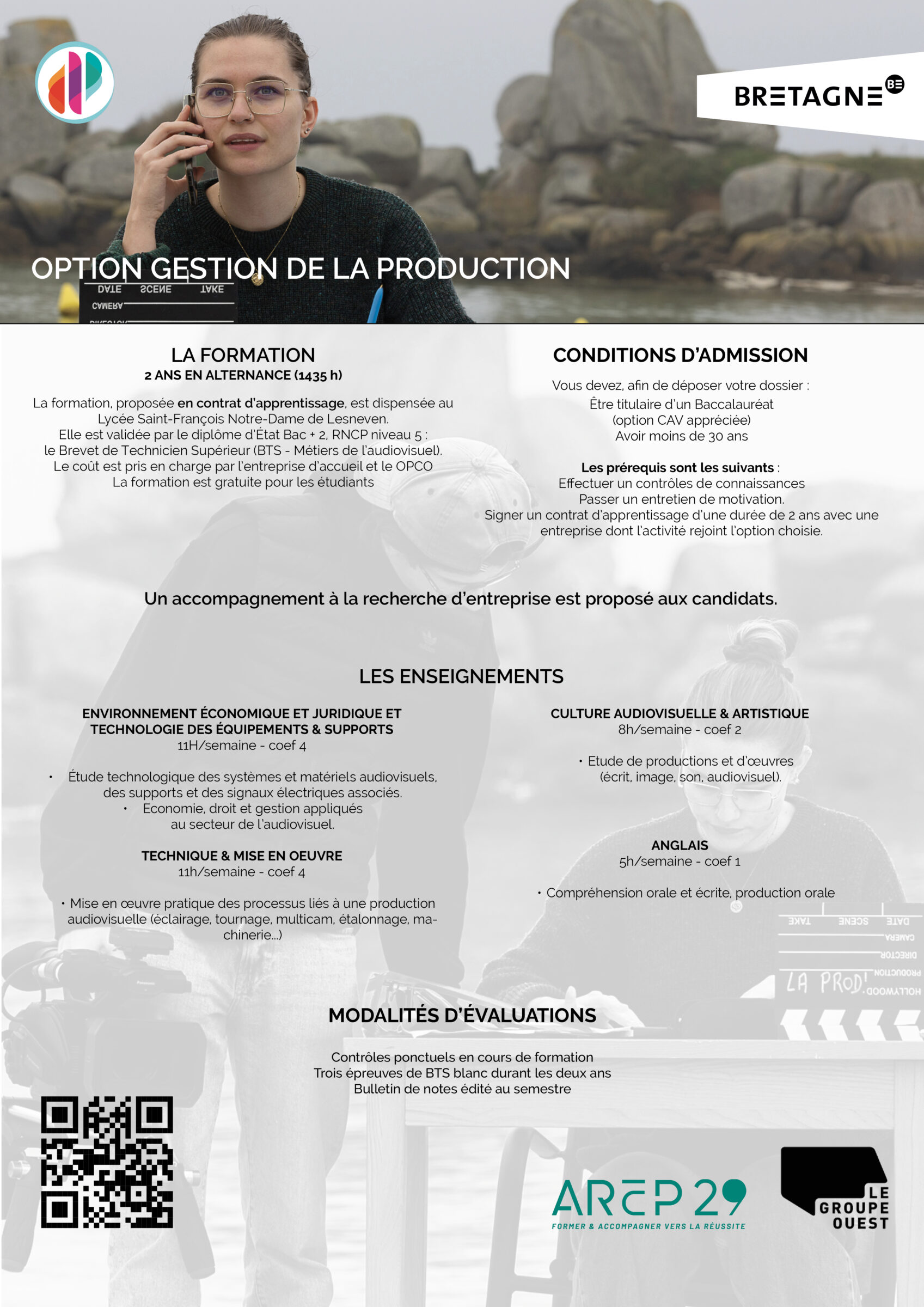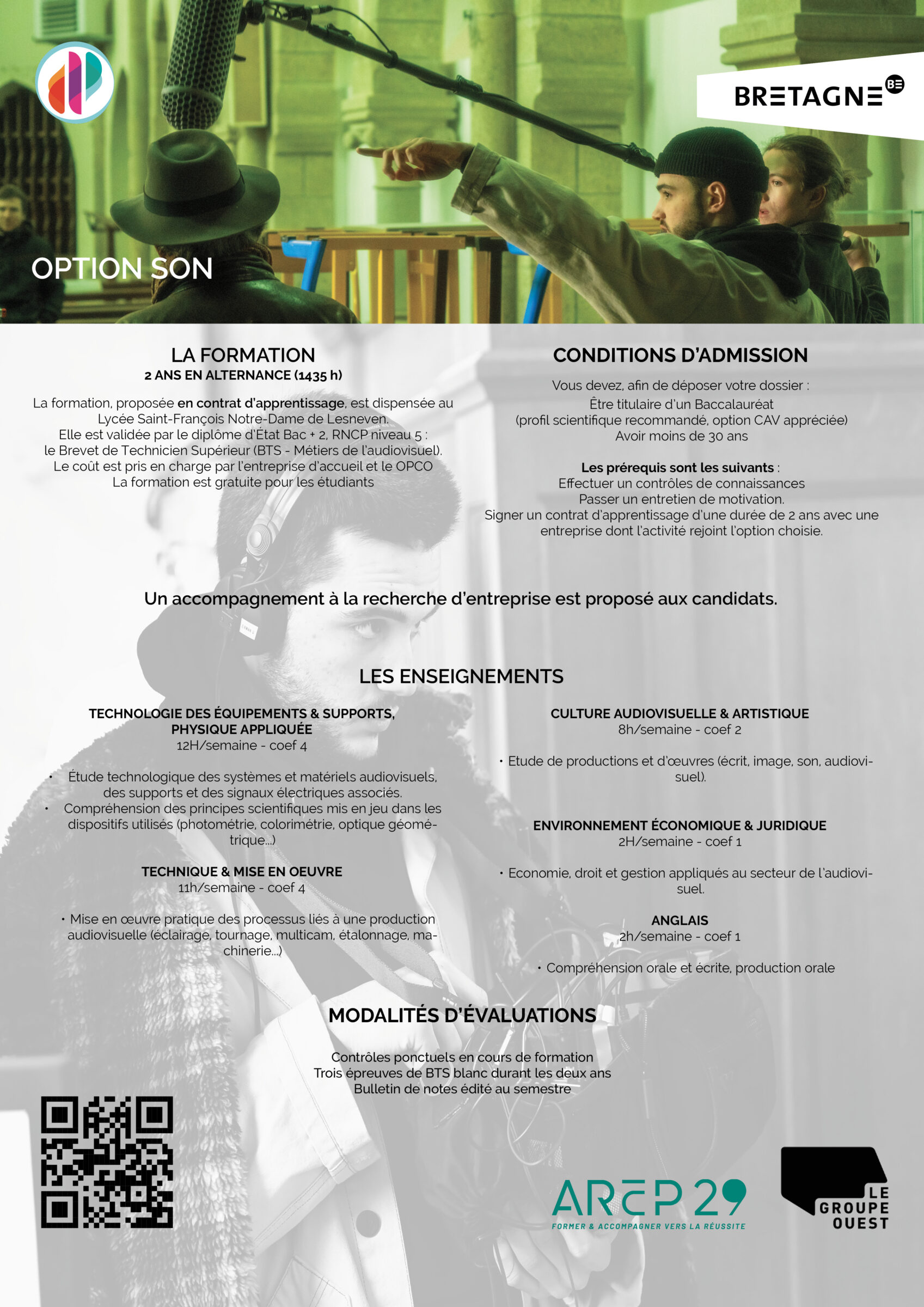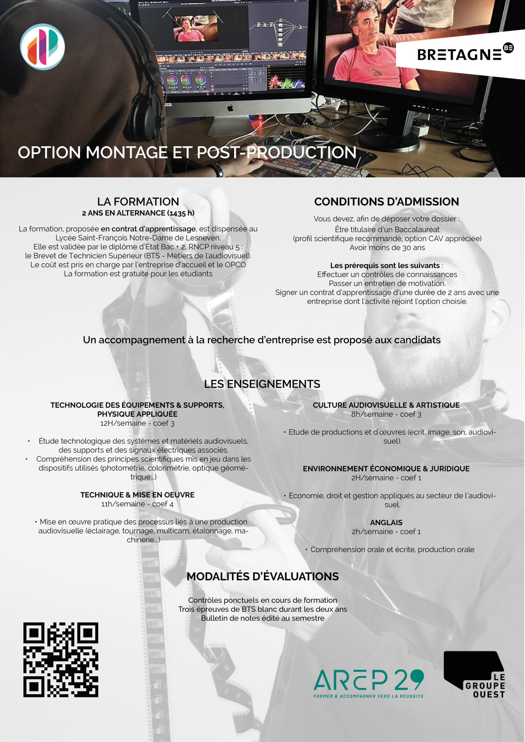 Situé au sein du Lycée Saint-François-Notre-Dame à Lesneven (29), notre Unité de Formation d’Apprentis (U.F.A.), vous prépare à l’obtention d’un Brevet de Technicien Supérieur aux Métiers de l’Audiovisuel.